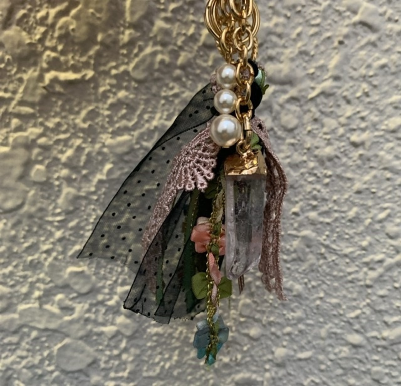 クリスタルとタッセルのチャームがついた
