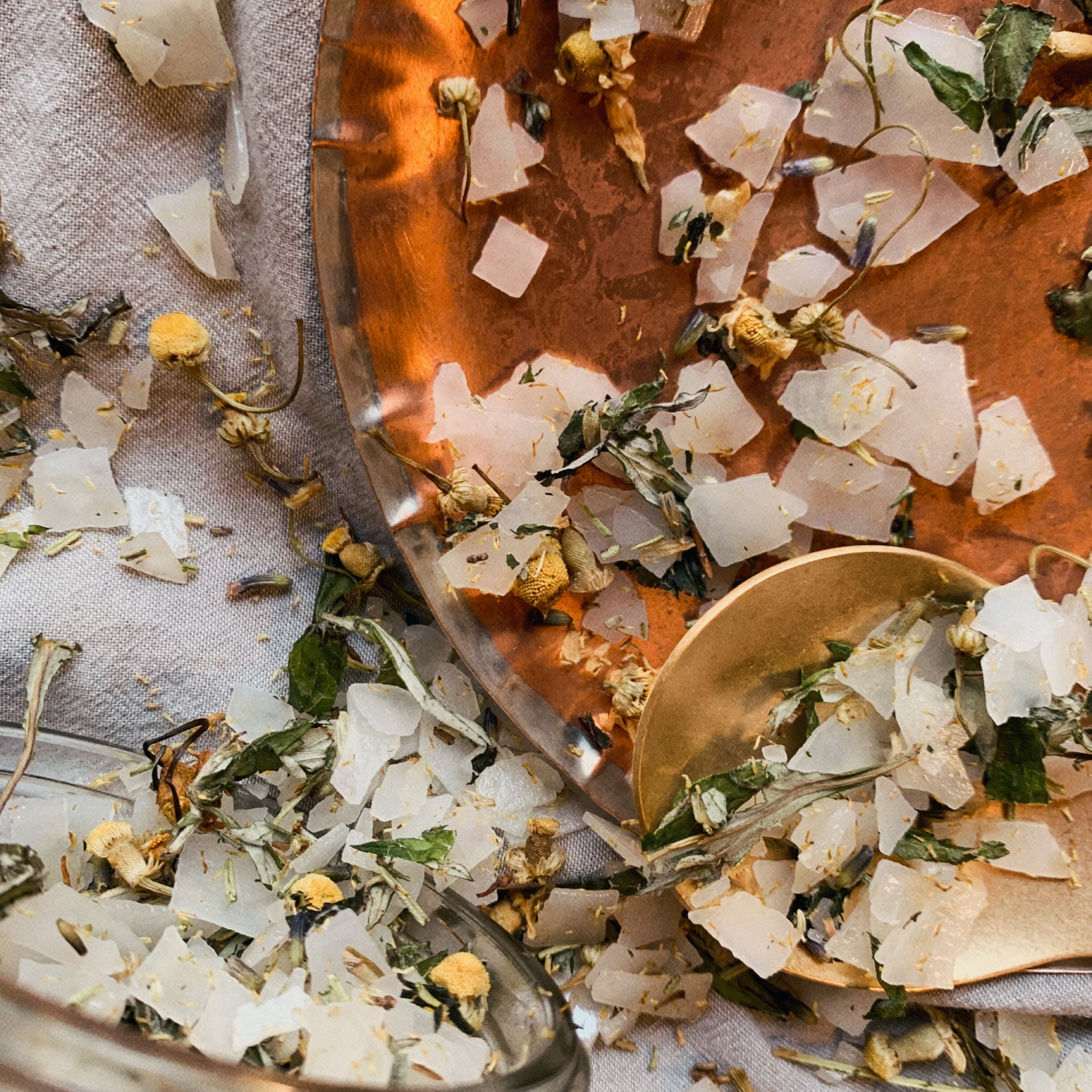 (器に飾る場合、マグネシウムフレークは時間が経つと溶け、シーソルト共に香りもつきますので、ガラスの器でお楽しみ下さい。